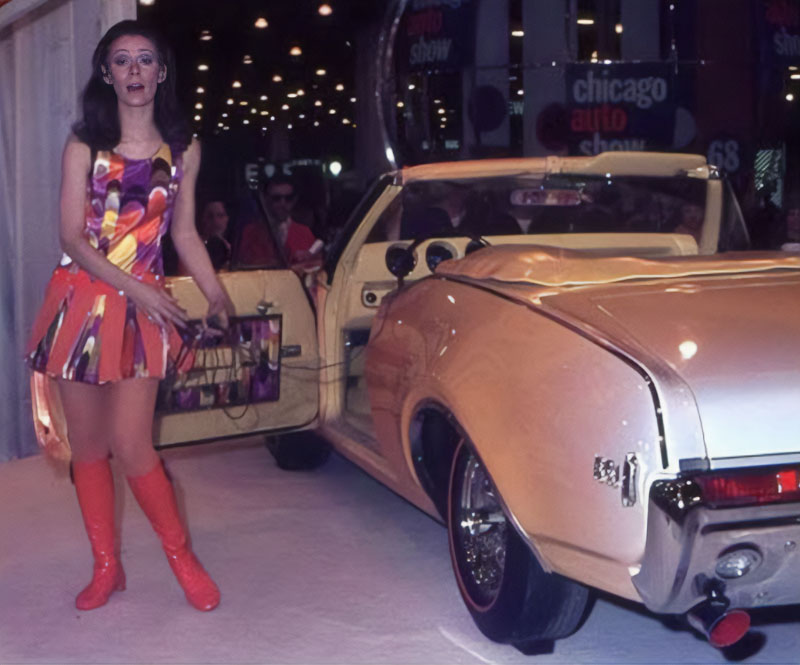 Manufacturers were courting the youth market in the late 1960s with muscle cars like the 350HP Oldsmobile 442. During the 1968 Chicago Auto Show, Oldsmobile featured the "Mod Rod" factory custom 442 convertible. The Cutlass-based ragtop was painted in colors that blended from pearl white in front to yellow in the center and metallic orange at the rear. The custom interior is trimmed in yellow and brown, executed by GM-Oldsmobile for the car show circuit. Female models dressed in outfits that matched the design, and materials featured in the car's interior were on hand to describe the special car to an enthusiastic crowd.